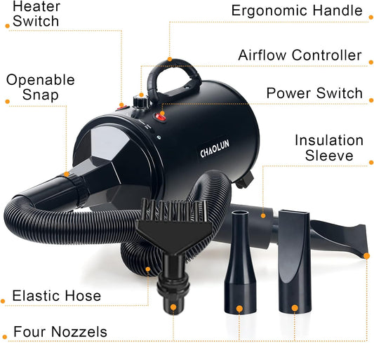 High Velocity Dog Dryer Blower, Professional Dog Grooming Dryer, Dog Blow Dryer 3.8HP, Pet Hair Dryer with Heater, Powerful Blow Force, Stepless Adjustable Speed, Quickly Dry, Black